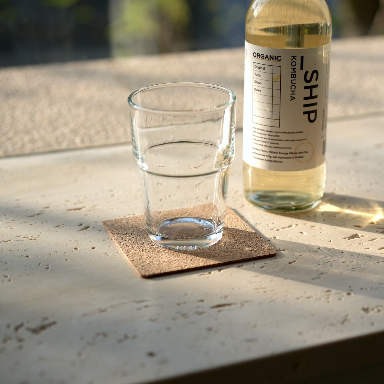 新素材の「高耐久リサイクルコルクシート」を使用した四角コースター。再生コルクにレーヨン生地を積層圧着した新開発の薄くて丈夫なコルクシートを使っているので、薄いけど丈夫、汚れたら水洗いして繰り返し使える、全く新しいタイプのコルクコースターです。