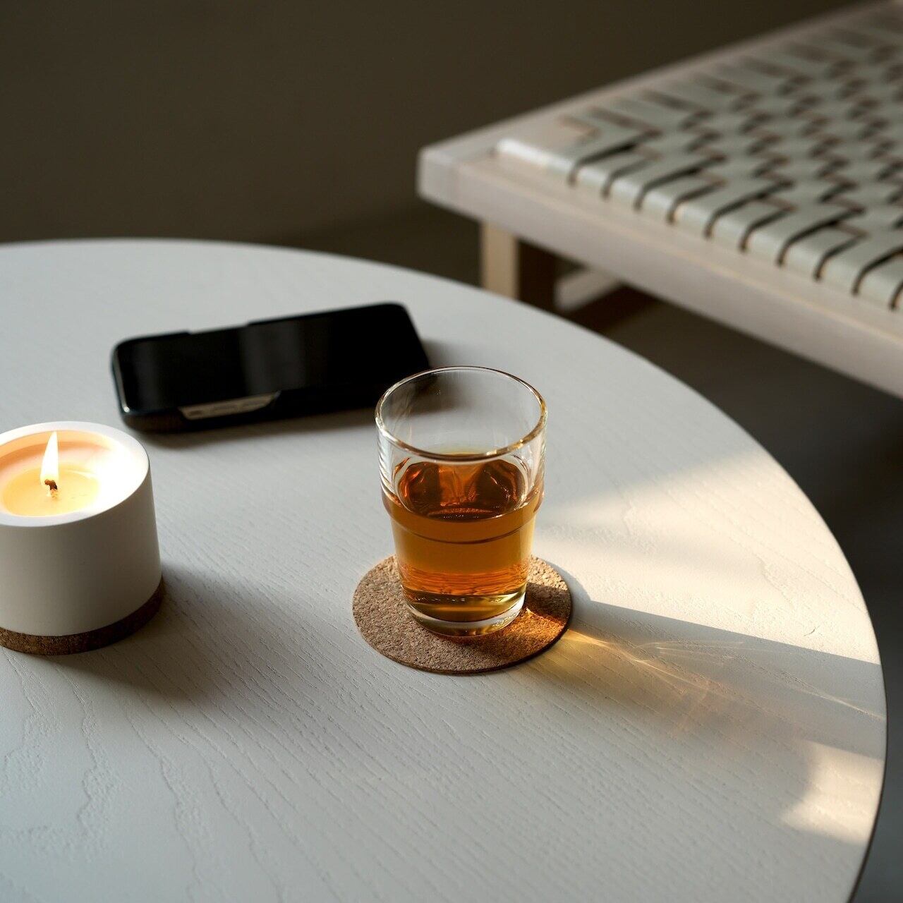 新素材の「高耐久リサイクルコルクシート」を使用した丸型コースター。再生コルクにレーヨン生地を積層圧着した新開発の薄くて丈夫なコルクシートを使っているので、薄いけど丈夫、汚れたら水洗いして繰り返し使える、全く新しいタイプのコルクコースターです。
